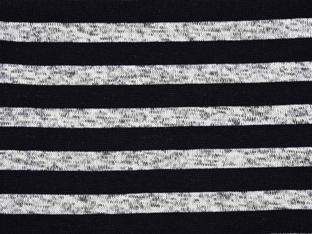 Ein weicher, dicker Strickstoff in grau melange mit schwarzen Streifen ( ca. 1,5 cm). Die Rückseite ist angeraut und somit kuschelig weich auf der Haut.