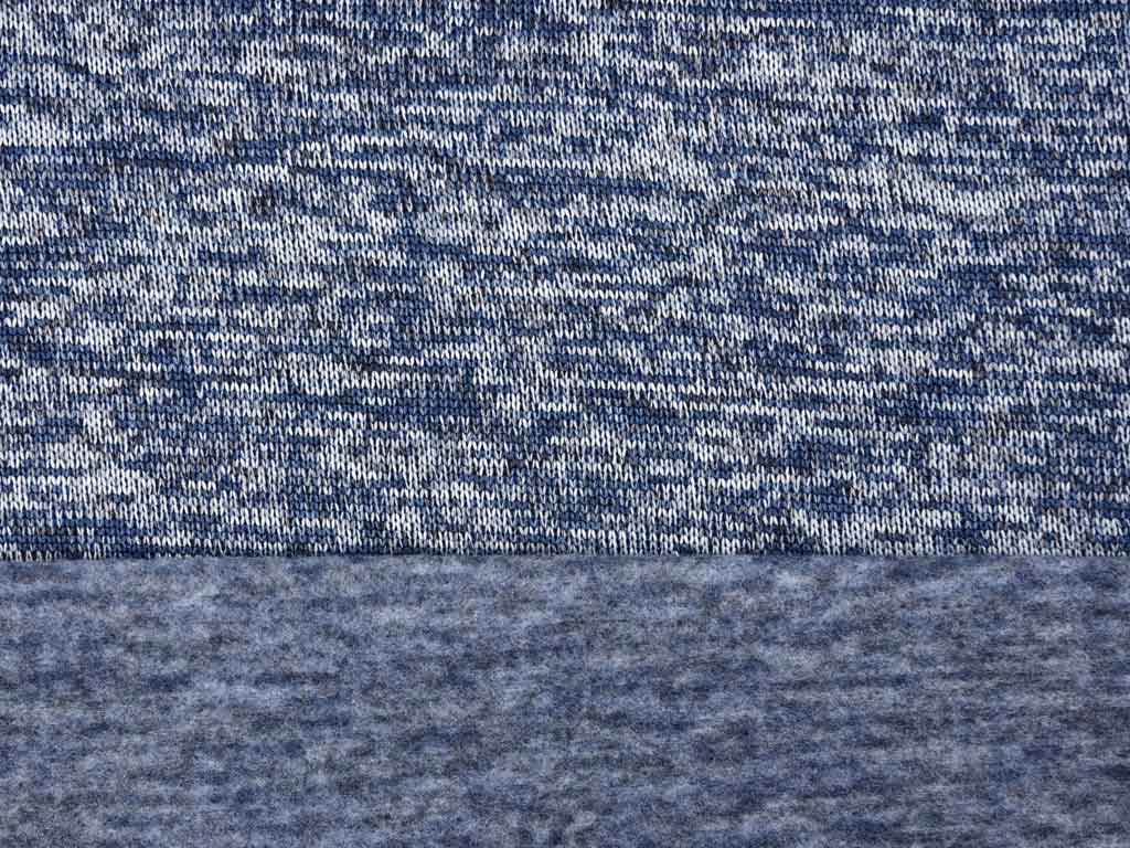 Ein weicher, dicker Strickstoff in blau hellblau meliert. Die Rückseite ist angeraut und somit kuschelig weich auf der Haut.