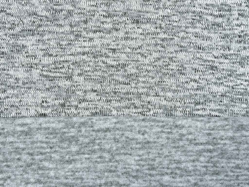 Ein weicher, dicker Strickstoff in grau hellgrau meliert. Die Rückseite ist angeraut und somit kuschelig weich auf der Haut.
