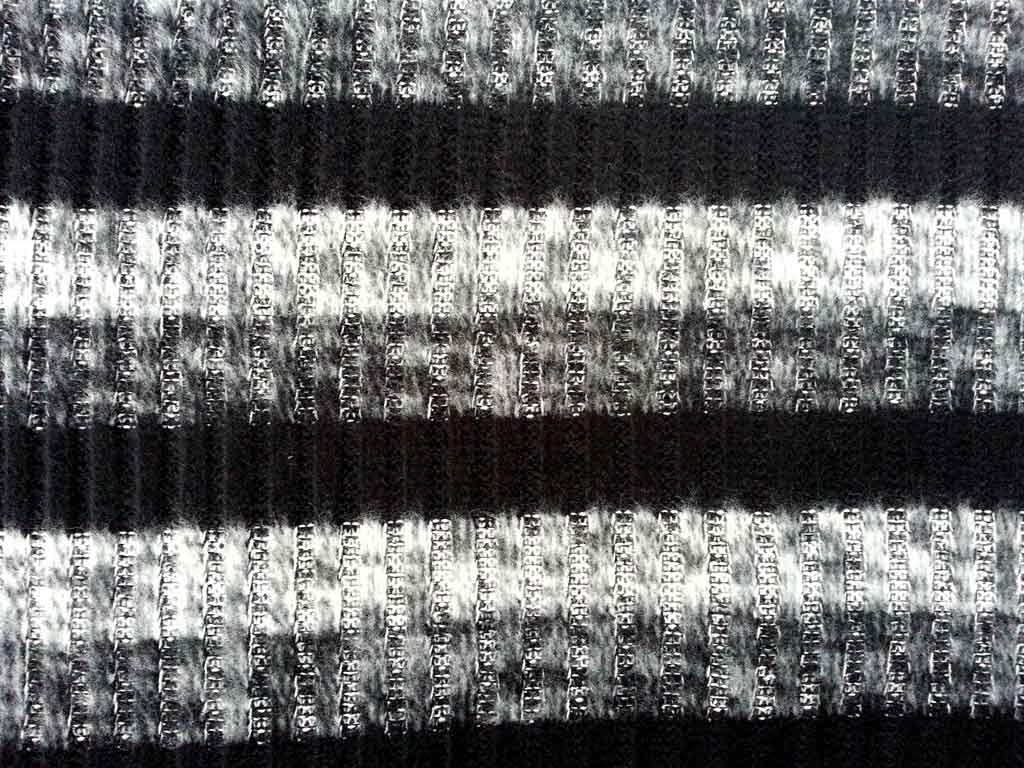 Ein etwas dickerer Strick mit Rippenmuster und 4 cm breiten Blockstreifen in schwarz und grau melange. Die Zöpfe in Längsrichtung sind leicht angeraut und somit sehr weich. Die gestrickte Rückseite ist nicht angeraut.