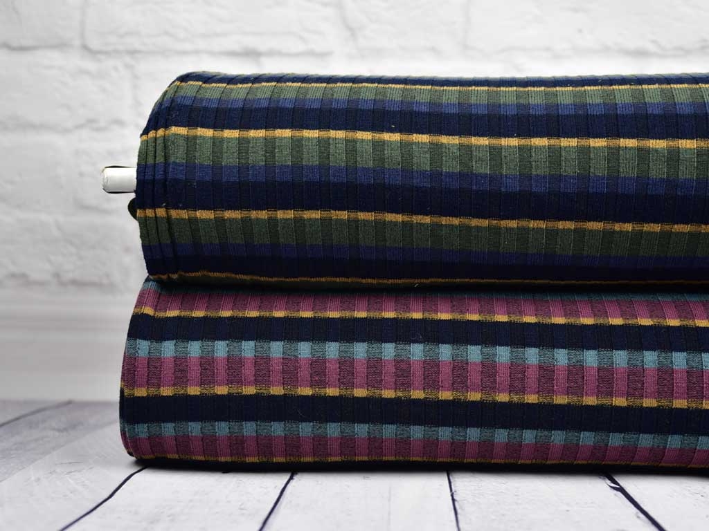 Ein weich und locker fallender Strick mit Colorblocking in altrosa, rauchblau, dunkelblau und ocker. Der Strick hat längslaufende Rippen.