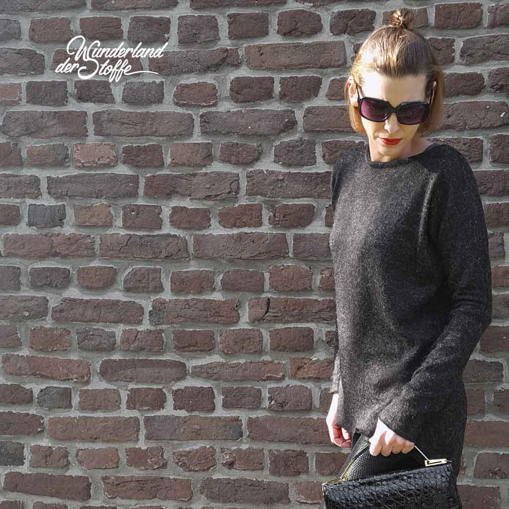 Ein weicher langhaariger Glattstrick in schwarz. Die heraushängenden "Haare" sind hellgrau.