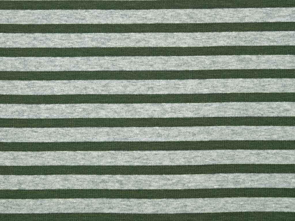 Ein weicher Alpenfleece Sweat in grau melange mit grünlichem Stich und khaki Streifen. Die khaki Streifen sind 0,5 cm breit, der Rest 1 cm.