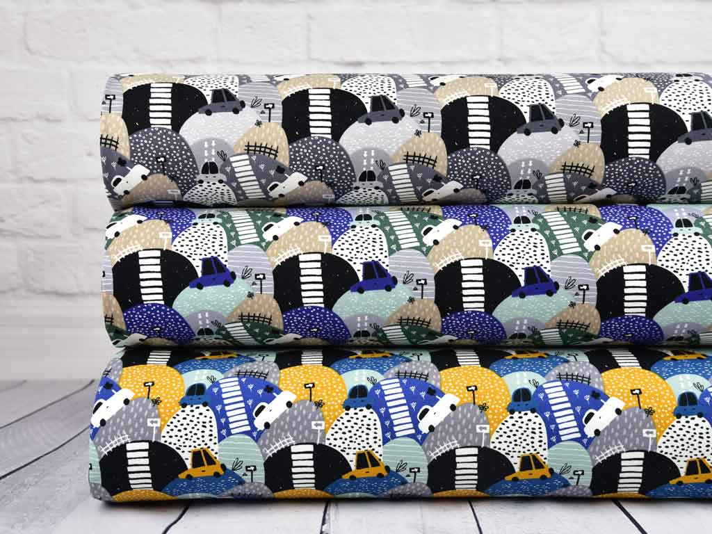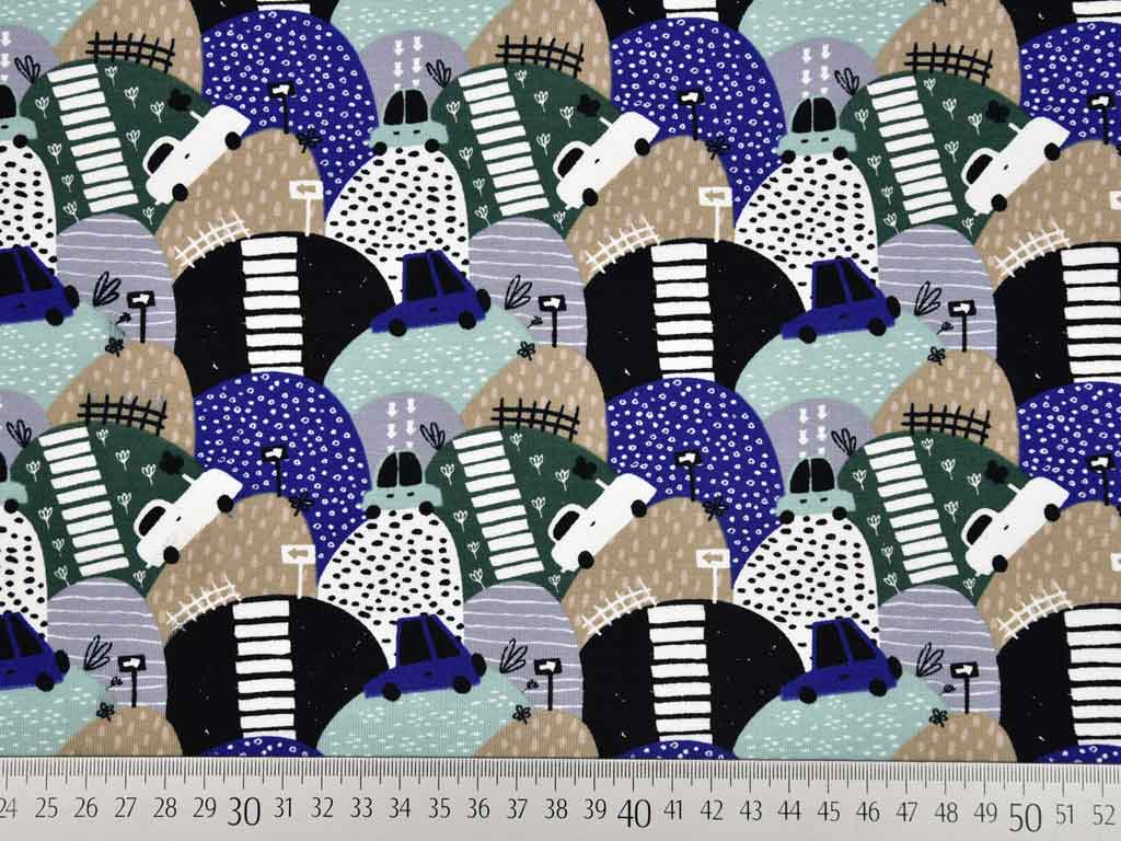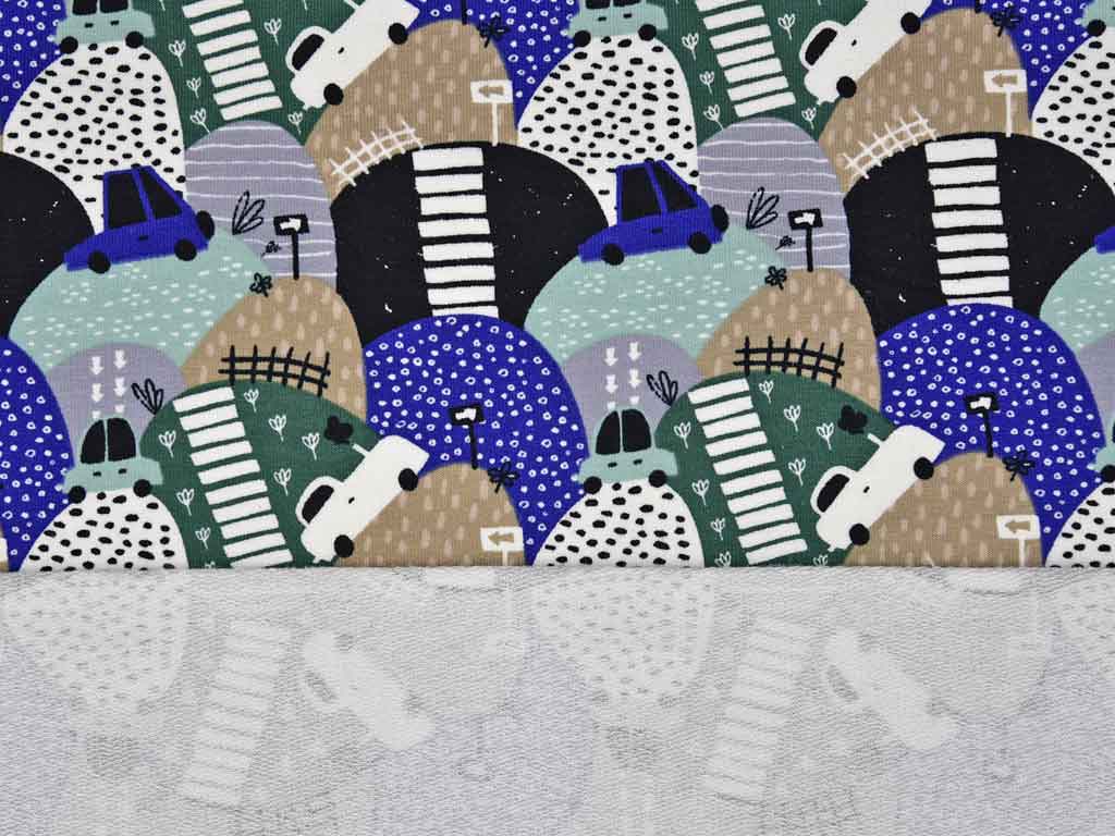 Ein weicher Sommersweat (French Terry) für Kinder mit gemusterten Bergen, kleinen Retro- Autos und Straßen in grün, blau, mint und beige. Die Rückseite ist nicht angeraut und zeigt die für French Terry üblichen Schlingen.