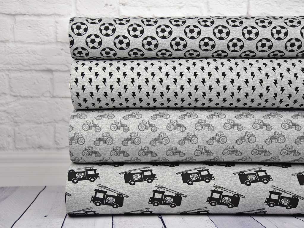 Ein grau melierter Sweat (French Terry) mit schwarzen Blitzen. Die Rückseite ist wie bei French Terry üblich nicht angeraut.