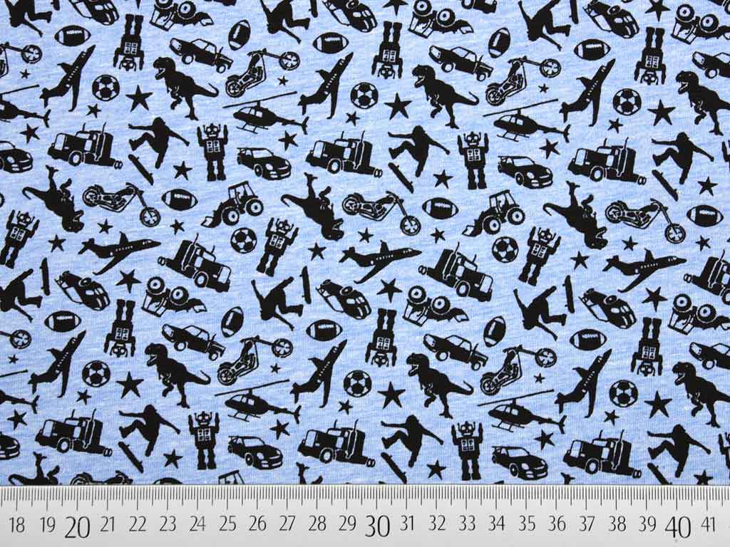 Ein toller French Terry Sweat in meliertem Hellblau und schwarzen Jungen Motiven z.B. Skateboarder, Autos, Trucks, Flugzeuge, Dinosaurier, Roboter, etc. Die Rückseite ist nicht angeraut und zeigt die für French Terry typischen Schlingen.