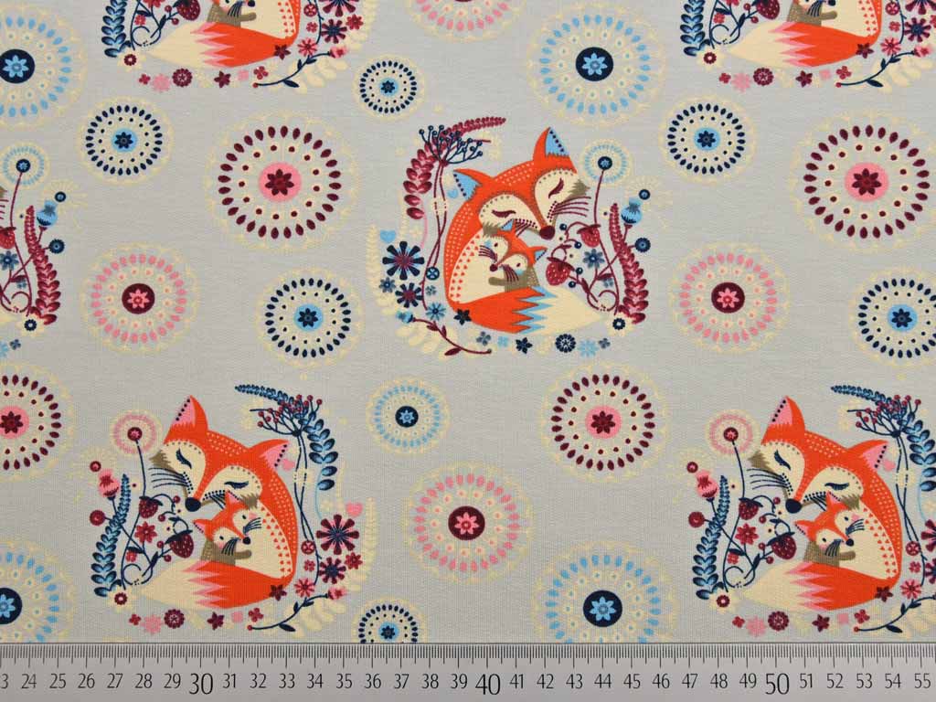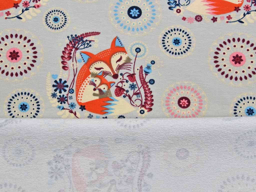 Ein weicher French Terry (unangerauter Sweat) in hellbeige mit süßen Füchsen und Fuchskindern sowie verschiedenen Blumen.