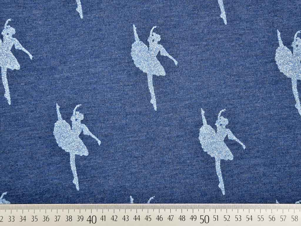 Ein weicher Sommersweat (French Terry) in jeansblau melange mit hellblauen Ballerinas, die mit silberfarbiger Glitzerbeschichtung überzogen sind. Die Rückseite ist nicht angeraut.