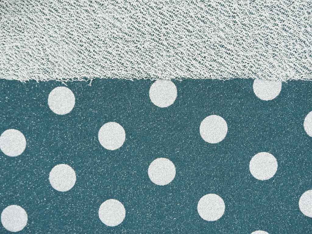 Ein weicher, petrolfarbener French Terry (unangerauter Sweat, Sommersweat) mit silbernen Glitzerpunkten. Der Stoff ist mit einem silbernen Metallfaden durchzogen.