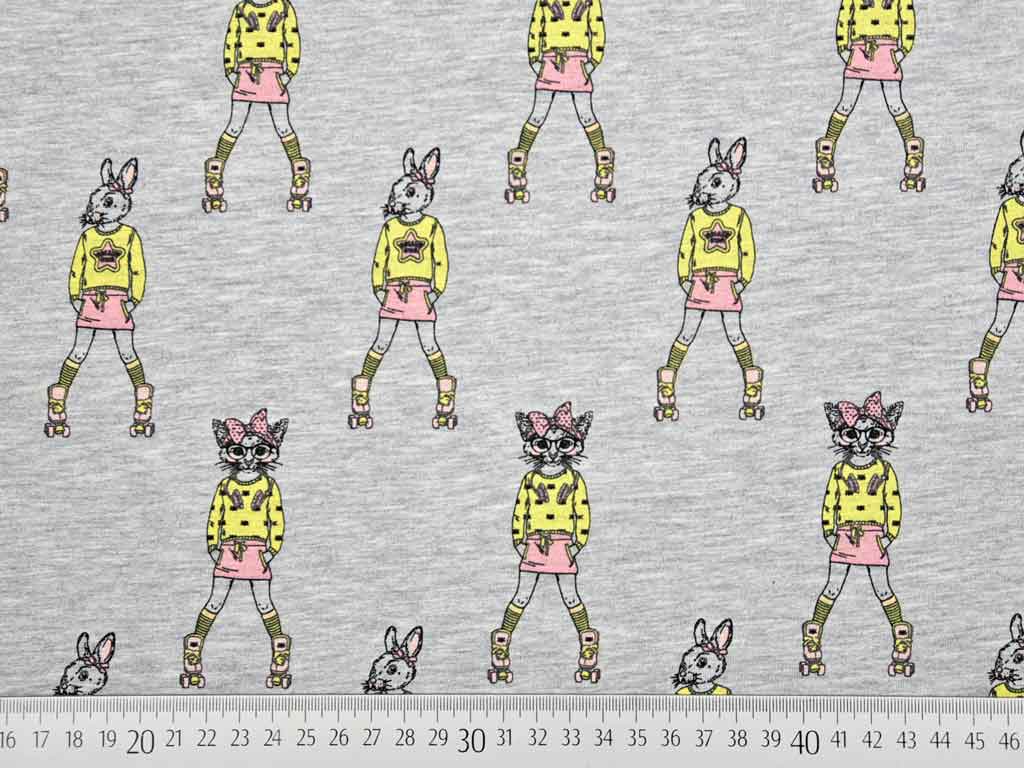 Aus dem Hause Stenzo ein weicher French Terry Sweat in hellgrau meliert mit lustigen Hasen Mädchen auf Rollerskates. Die Rückseite ist nicht angeraut und zeigt die für French Terry üblichen Schlingen.