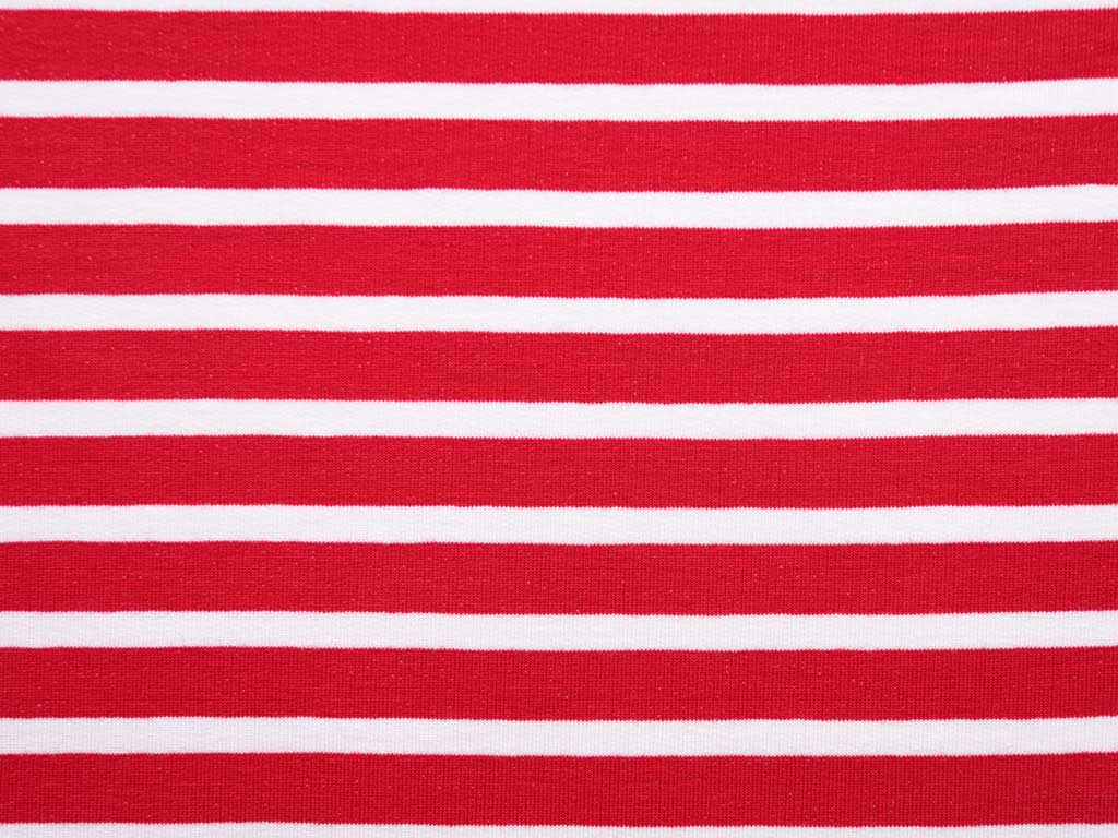 Ein weicher Sommersweat (French Terry) mit unangerauter Rückseite und 1 cm breiten Streifen in rot und weiß.