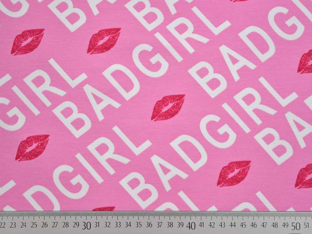 Ein cooler rosa French Terry Sweat (Sommersweat) mit weißem "Bad Girl" Schriftzug und himbeerrotem Kussmund. Die Rückseite ist nicht angeraut und zeigt die für French Terry üblichen Schlingen.