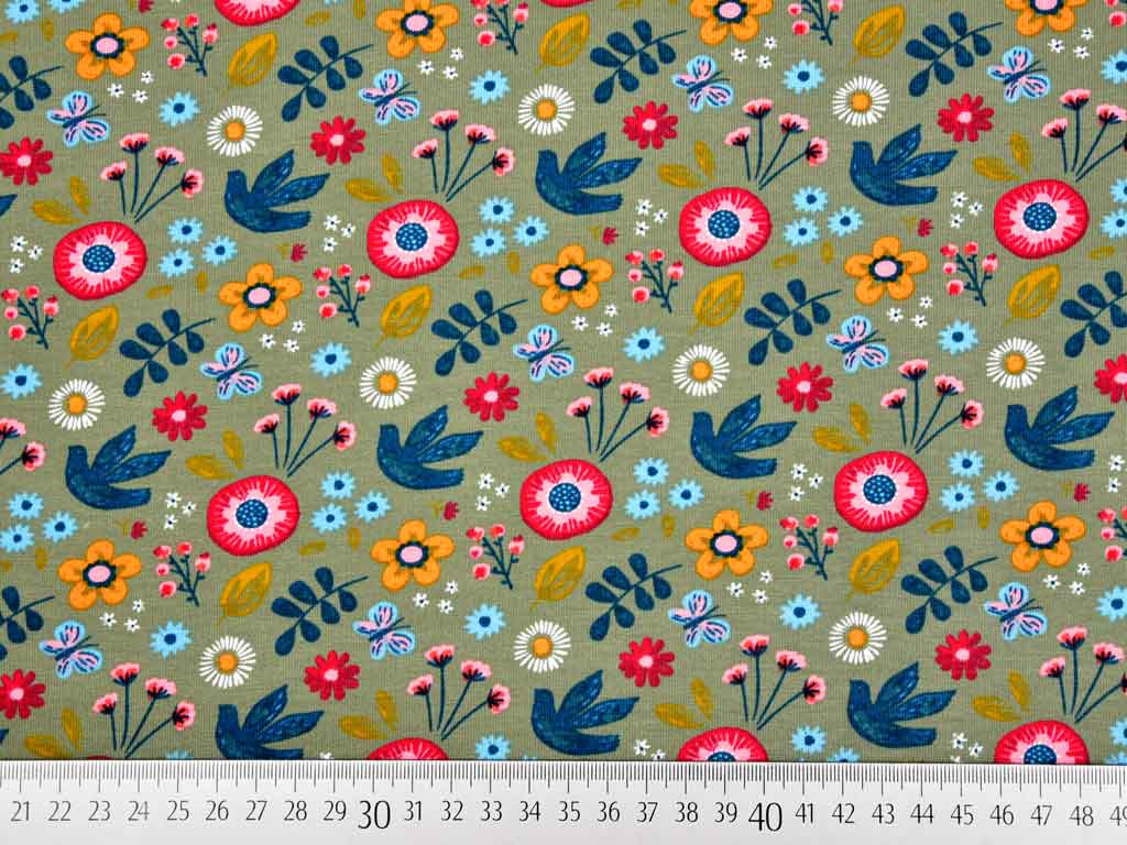 Ein wunderschöner French Terry Sweat in khaki mit bunten Blumen und Tauben. Die Rückseite ist nicht angeraut und zeigt die für French Terry typischen Schlingen.