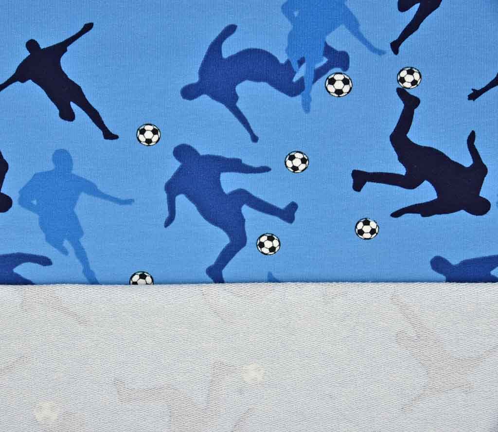 Ein cooler jeansblauer Sommersweat (French Terry) mit Fußballern in verschiedenen Blautönen und schwarz-weißen Fußbällen. Die Rückseite ist nicht angeraut und zeigt die für French Terry üblichen Schlingen.