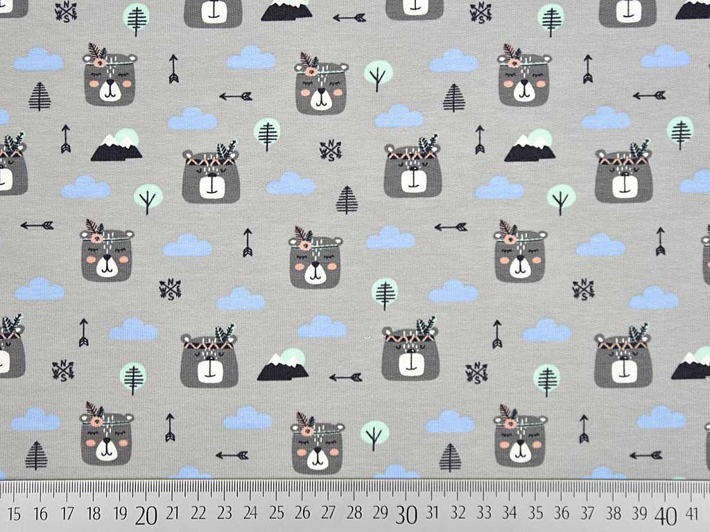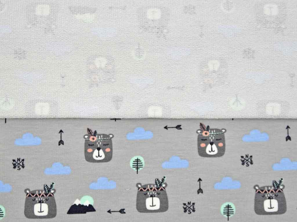 Ein weicher, hellgrauer French Terry Sweat (Sommersweat) mit süßen Indianerbären in dunkelgrau und hellblauen Wolken. Die Stoffrückseite ist nicht angeraut und zeigt die für French Terry üblichen Schlingen.