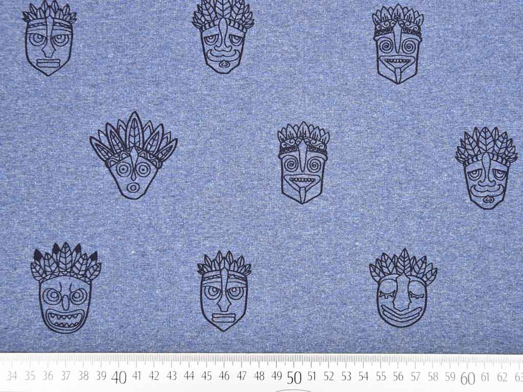 Ein super cooler French Terry (unangeraute Rückseite) Sweatshirtstoff in angesagtem jeansblau melange bedruckt mit dunkelblauen Inka Köpfen. Die Rückseite zeigt die für French Terry typischen Schlingen.