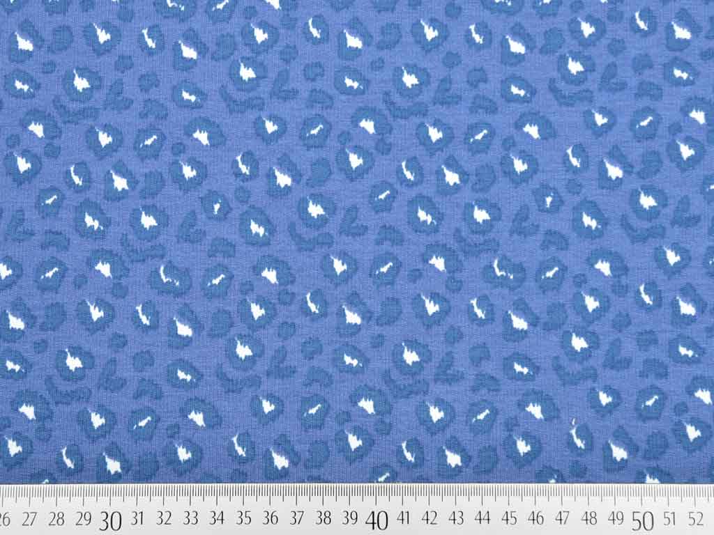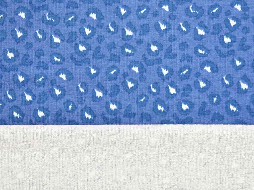 Ein weicher blauer French Terry (Sommersweat) mit dunkelblauem Leopardenmuster. Die Stoffrückseite ist nicht angeraut und zeigt die für French Terry üblichen Schlingen.