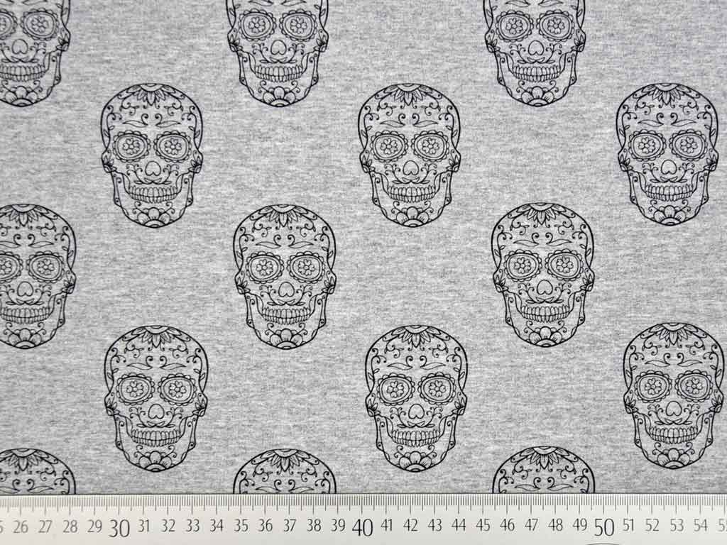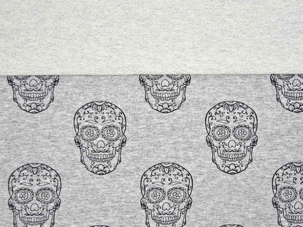 Ein super cooler French Terry Sweatshirtstoff (unangeraute Rückseite) in angesagtem Grau melange mit dekorativen Totenköpfen in schwarz. Die Rückseite zeigt die für French Terry typischen Schlingen.