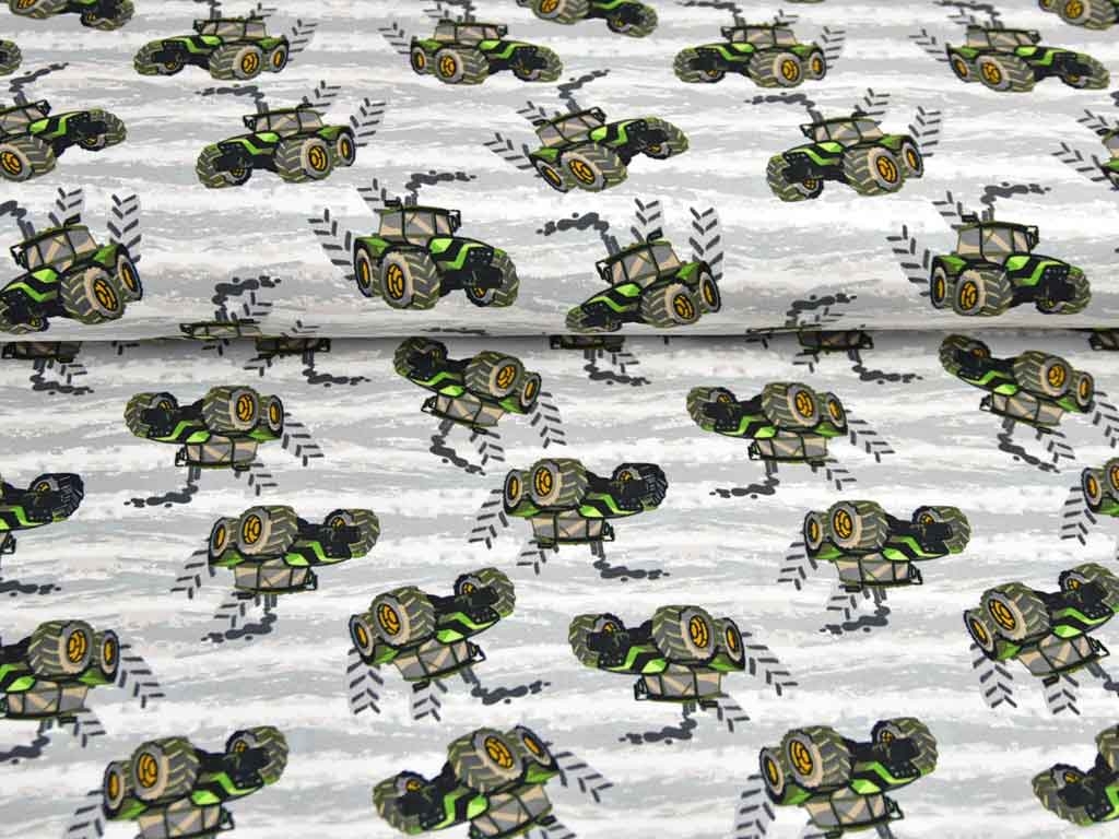 Ein weicher, hellgrauer French Terry (Sommersweat) mit coolen Traktoren in grün, grau und schwarz. Die Stoffrückseite ist nicht angeraut und zeigt die für French Terry üblichen Schlingen.