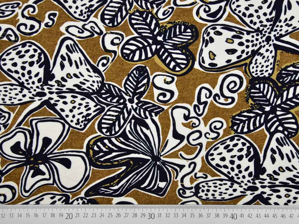 Ein weich fließender Viskose French Terry (Sommersweat) in ocker mit einem floralen afrikanischen Muster in den Farben schwarz und creme. Die Rückseite ist nicht angeraut und zeigt die für French Terry üblichen Schlingen.