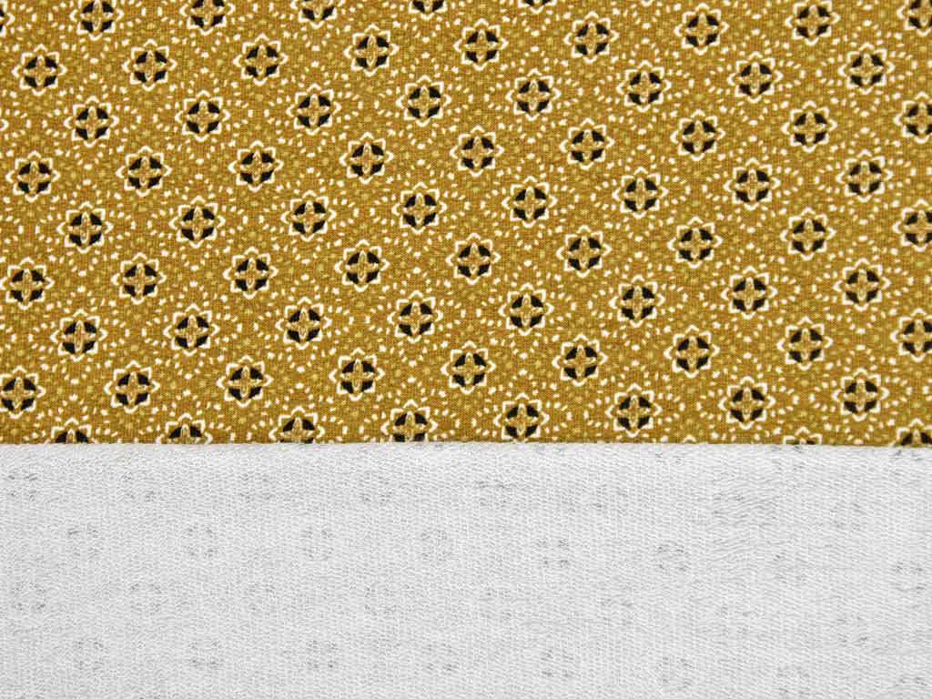 Ein weich fließender Viskose French Terry (Sommersweat) in ocker mit kleinen zierlichen Blumenrädern in schwarz und creme. Die Rückseite ist nicht angeraut und zeigt die für French Terry üblichen Schlingen.