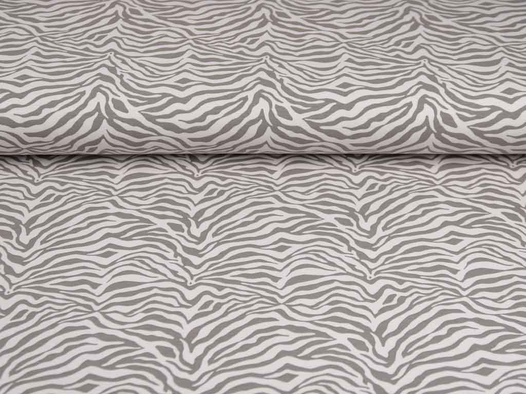 Ein weicher French Terry Sweat (Sommersweat) in ecru mit taupefarbenem Zebramuster. Die Stoffrückseite ist nicht angeraut und zeigt die für French Terry üblichen Schlingen.