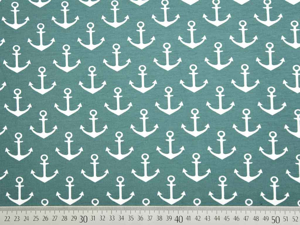 Ein weicher French Terry Sweat (Sommersweat) in dunkelmint mit weißen Ankern. Die Rückseite ist nicht angeraut und zeigt die für French Terry üblichen Schlingen.