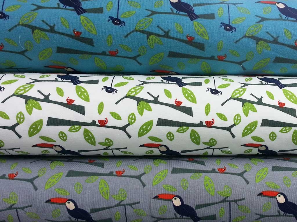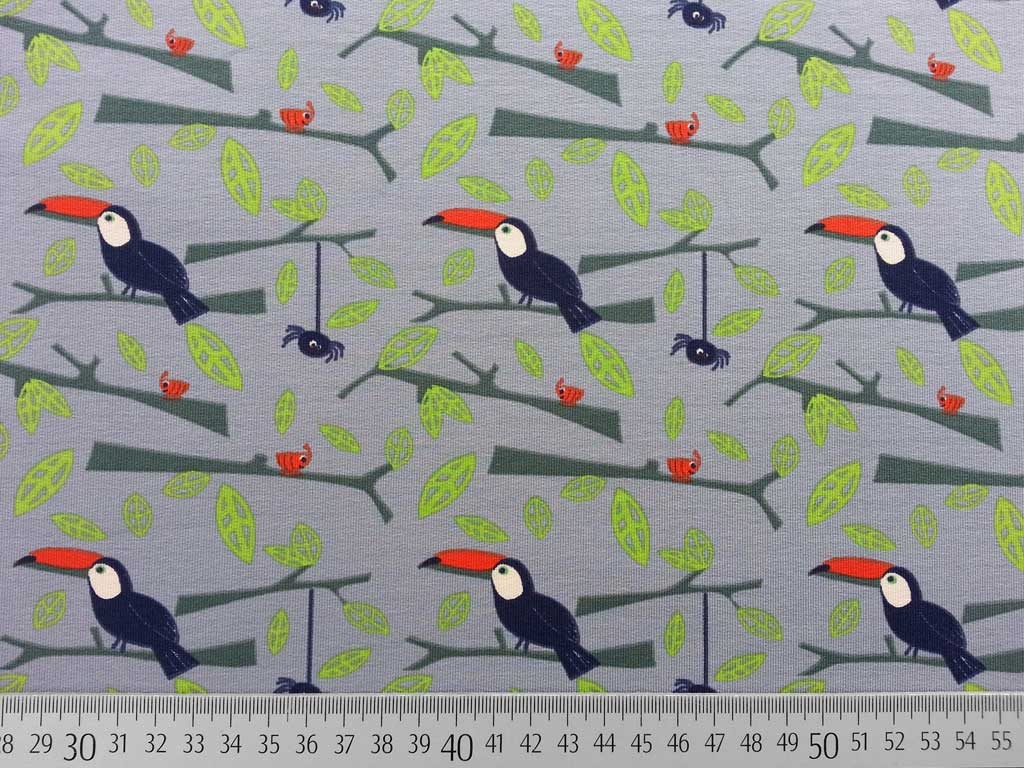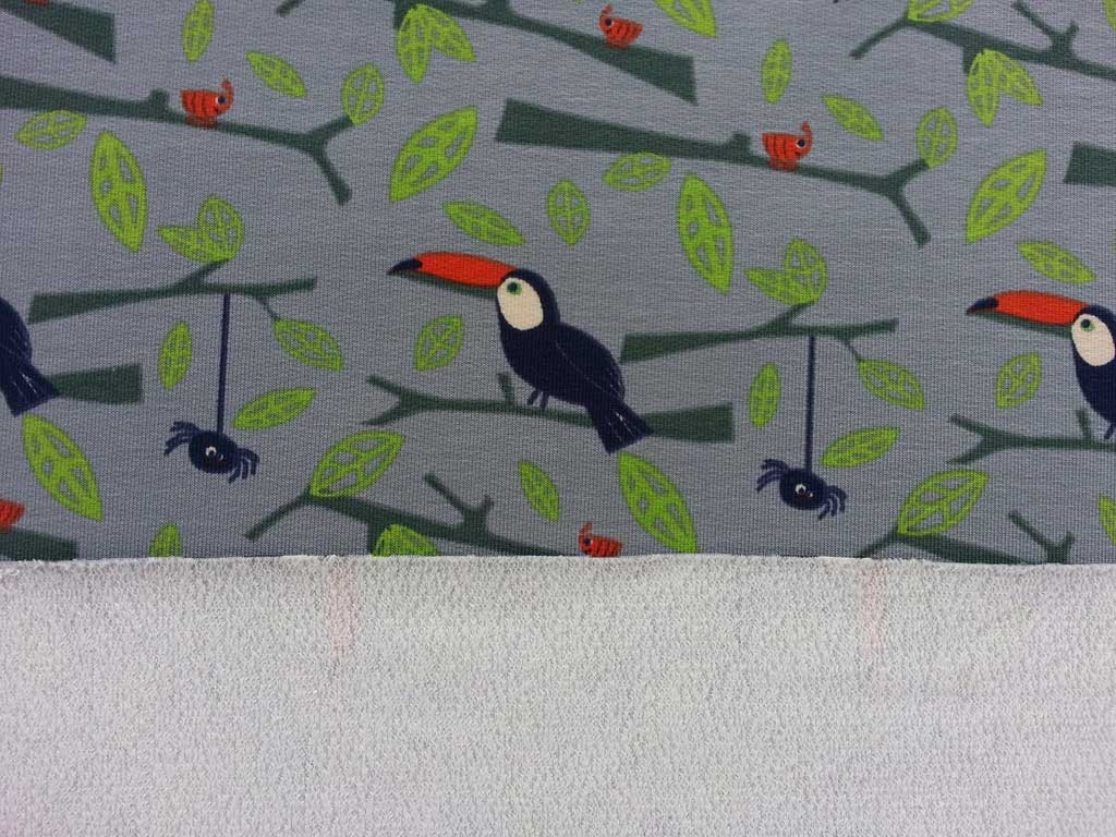 Ein toller French Terry (unangerauter Sweat) in mittelgrau mit süßen Tukans, Ästen mit Blättern.