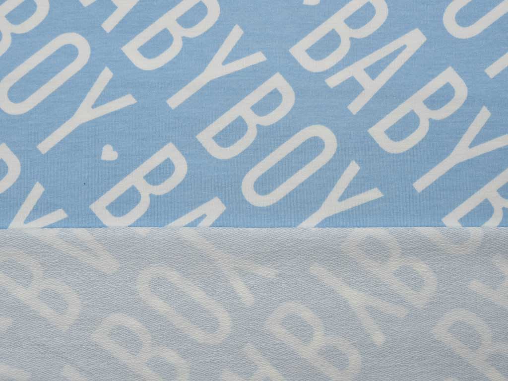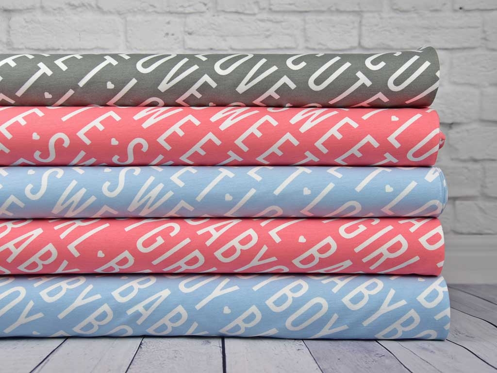 Ein weicher French Terry Sommersweat von Ilja Fabrics in dezentem Koralle mit weißem Aufdruck "BABY GIRL" und kleinen, weißen Herzen. Einfach so lässig!! Die Rückseite zeigt die für French Terry typischen Schlingen.