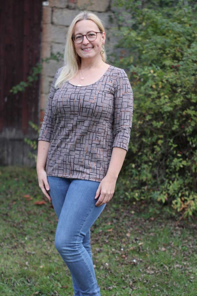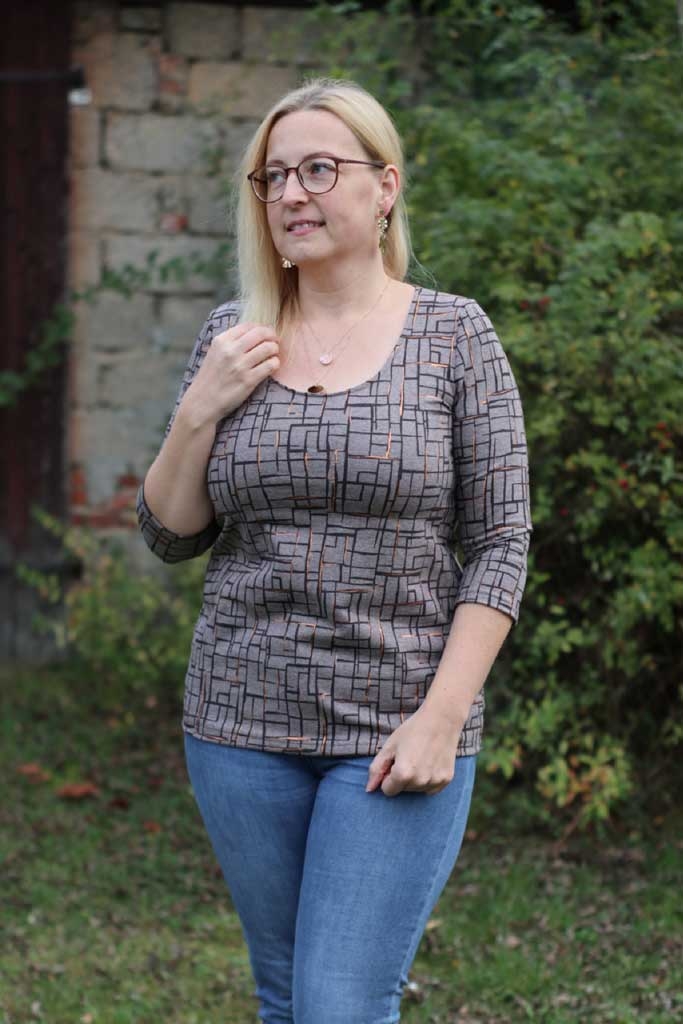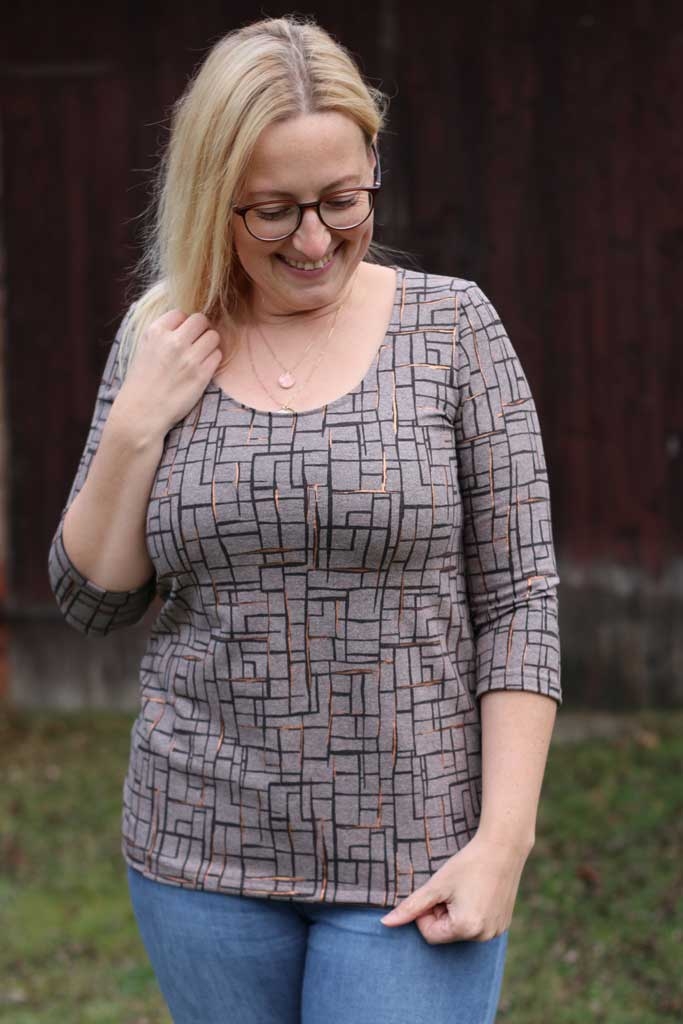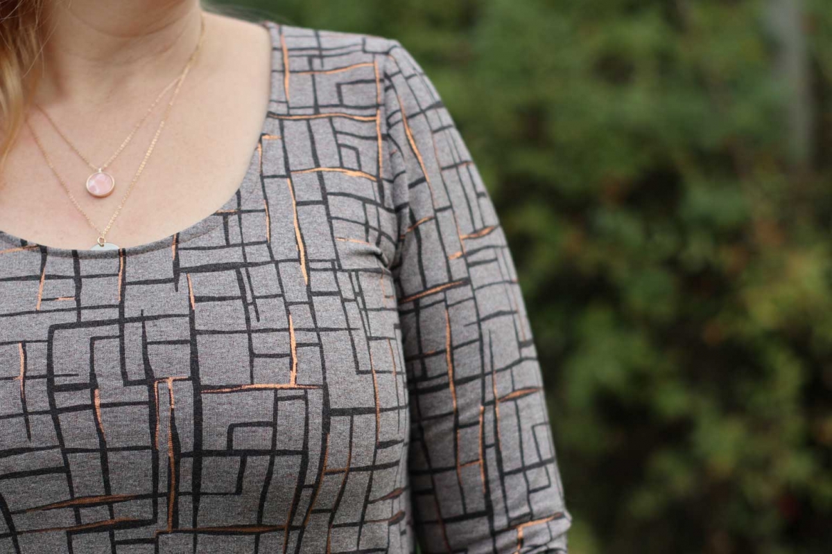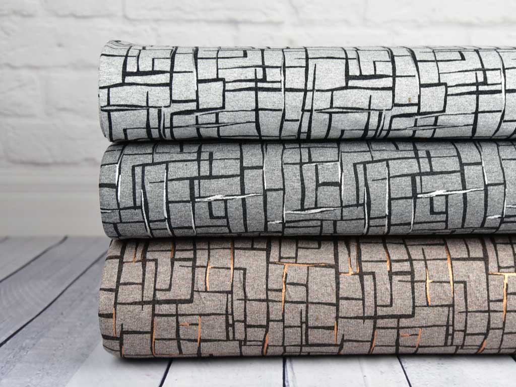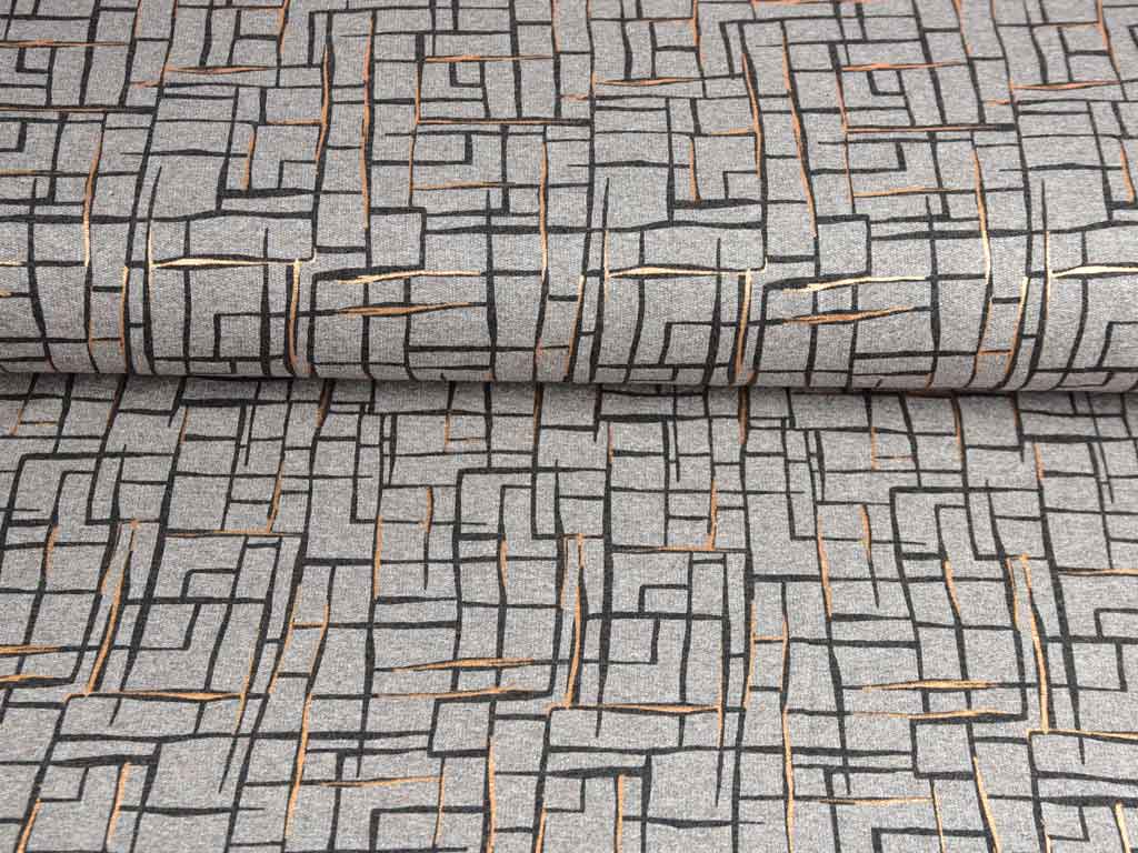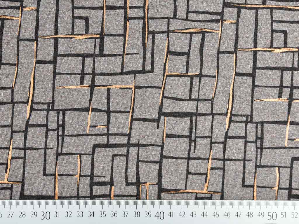 Ein weicher, taupe melierter Sommersweat (French Terry) mit einem abstrakten dunkelbraunen Gittermuster. Teile des Gittermusters sind mit kupferfarbener Metallfolie überdruckt. Die Rückseite ist nicht angeraut und zeigt die für French Terry üblichen Schlingen.