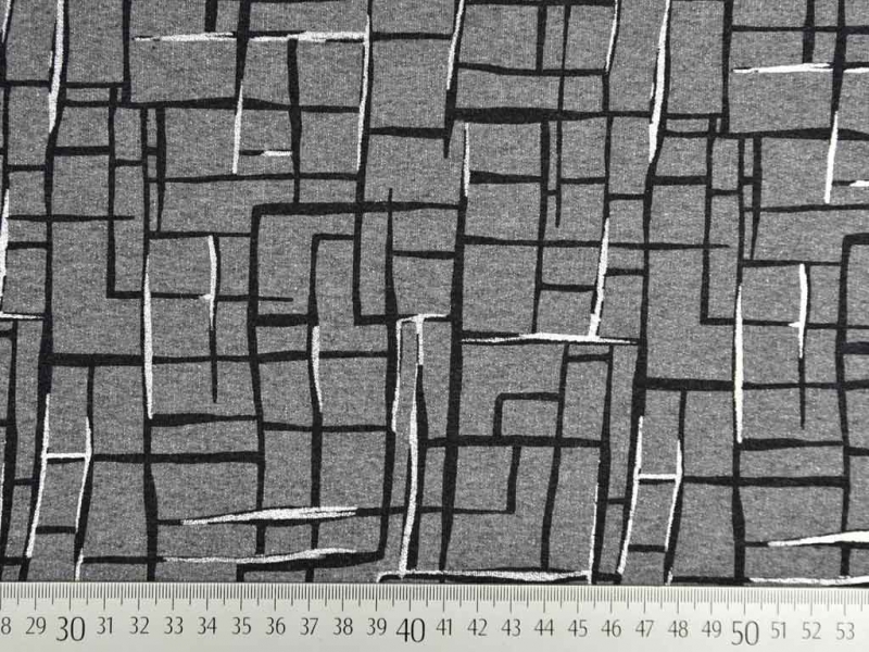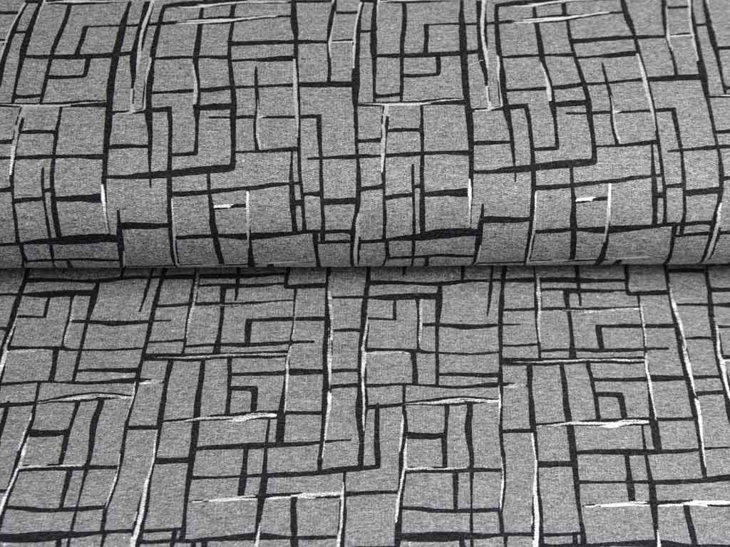 Ein weicher, anthrazit melierter Sommersweat (French Terry) mit einem abstrakten schwarzen Gittermuster. Teile des Gittermusters sind mit silberfarbener Metallfolie überdruckt. Die Rückseite ist nicht angeraut und zeigt die für French Terry üblichen Schlingen.