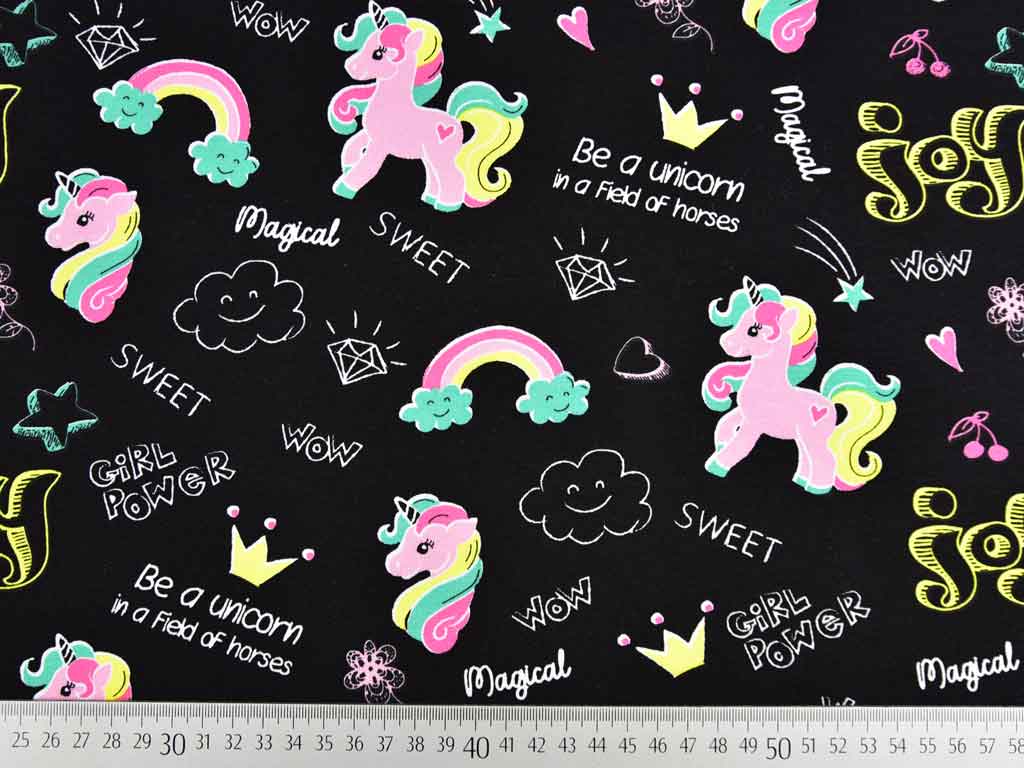 Ein weicher schwarzer French Terry (Sommersweat) mit niedlichen Mädchenmotiv. Rosa Einhörner und Regenbögen sind umgeben von Wolkengesichtern, rosa Blümchen, Kirschen und Herzchen, gelben Krönchen, mintfarbenen Sternen sowie coolen Sprüchen in Weiß. Die Einhörner sind ca 6,0 cm groß, die Regenbögen sind ca 6,0 cm in der Länge und 3,0 cm in der Höhe. Die Stoffrückseite ist nicht angeraut und zeigt die für French Terry üblichen Schlingen.