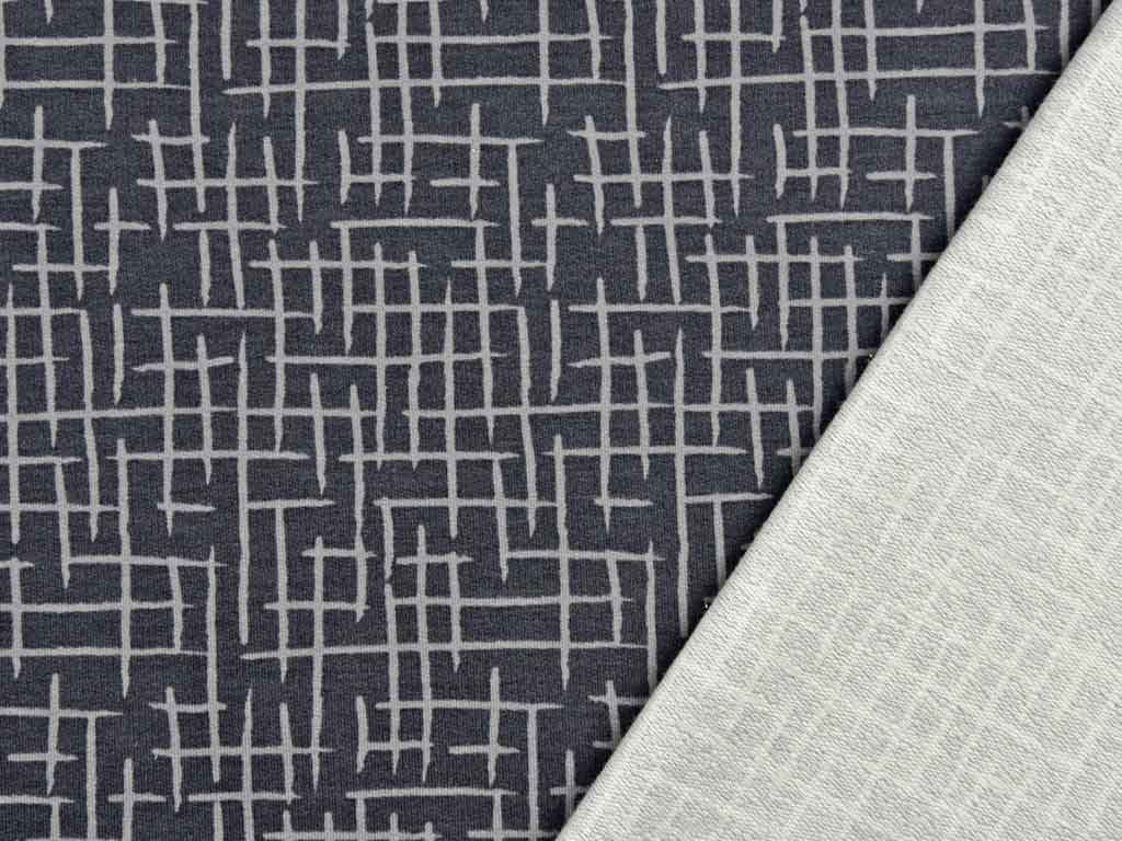 Ein weicher, dunkelgrauer French Terry (Sommersweat) mit hellgrauen Strichen. Die Stoffrückseite ist nicht angeraut und zeigt die für French Terry üblichen Schlingen.