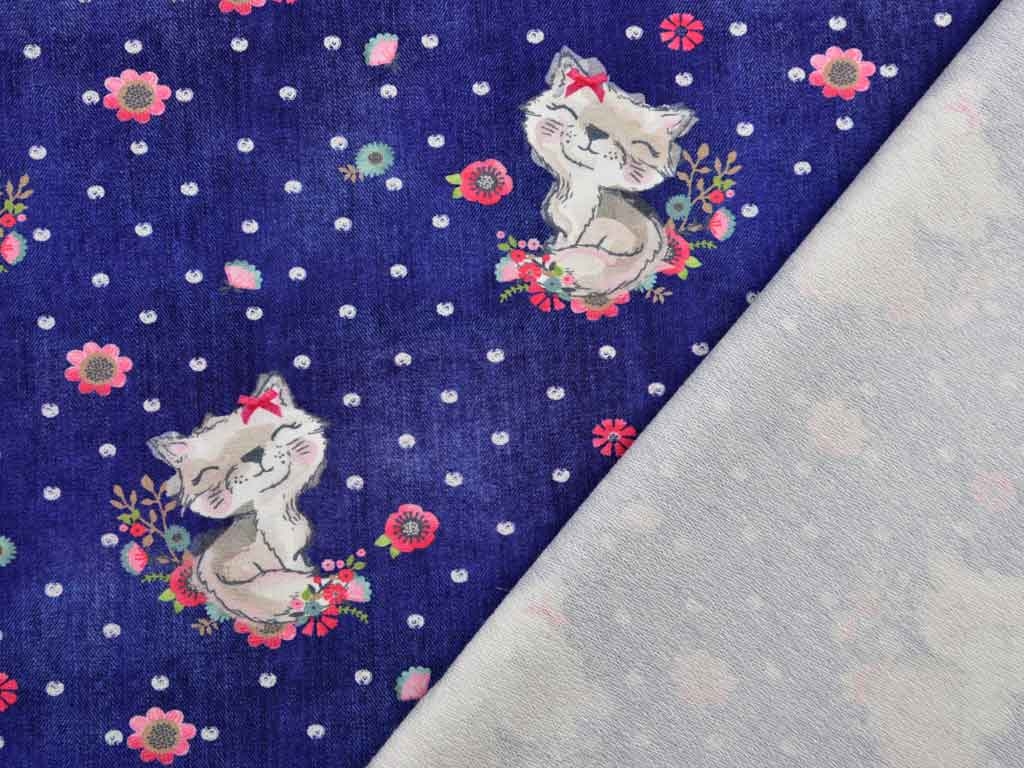 Ein dunkelblauer French Terry Sweat als Jeanslook mit niedlichen Kätzchen, die von rosa Blümchen umrandet sind. Die Kätzchen sind zusätzlich von kleinen weißen Punkten umgeben. Die Rückseite zeigt die für French Terry üblichen Schlingen.