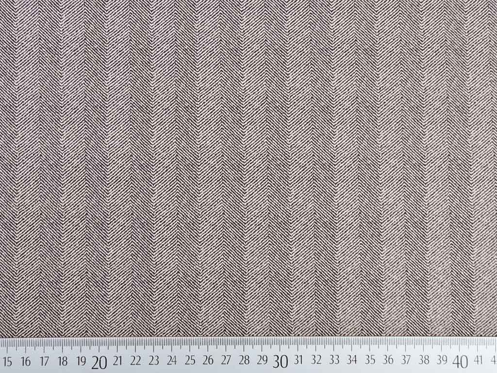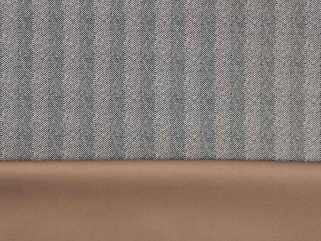 Ein dünner Scuba in beige mit Wildleder Haptik und kleinem, dunkelgrauem Fischgrätmuster. Der Stoff erinnert vom Griff an Surfanzügen (daher der Name "Scuba"), denn er ist kompakt, hat einen gewissen Stand und ist aber trotzdem weich im Griff.