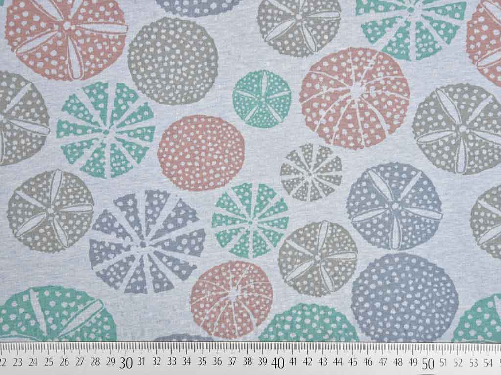 Ein weicher Sweat aus Bio-Baumwolle in hellblau meliert mit altrosa, mint, hellblauen und grauen Muscheln. Die Rückseite ist angeraut und somit kuschelig weich auf der Haut.