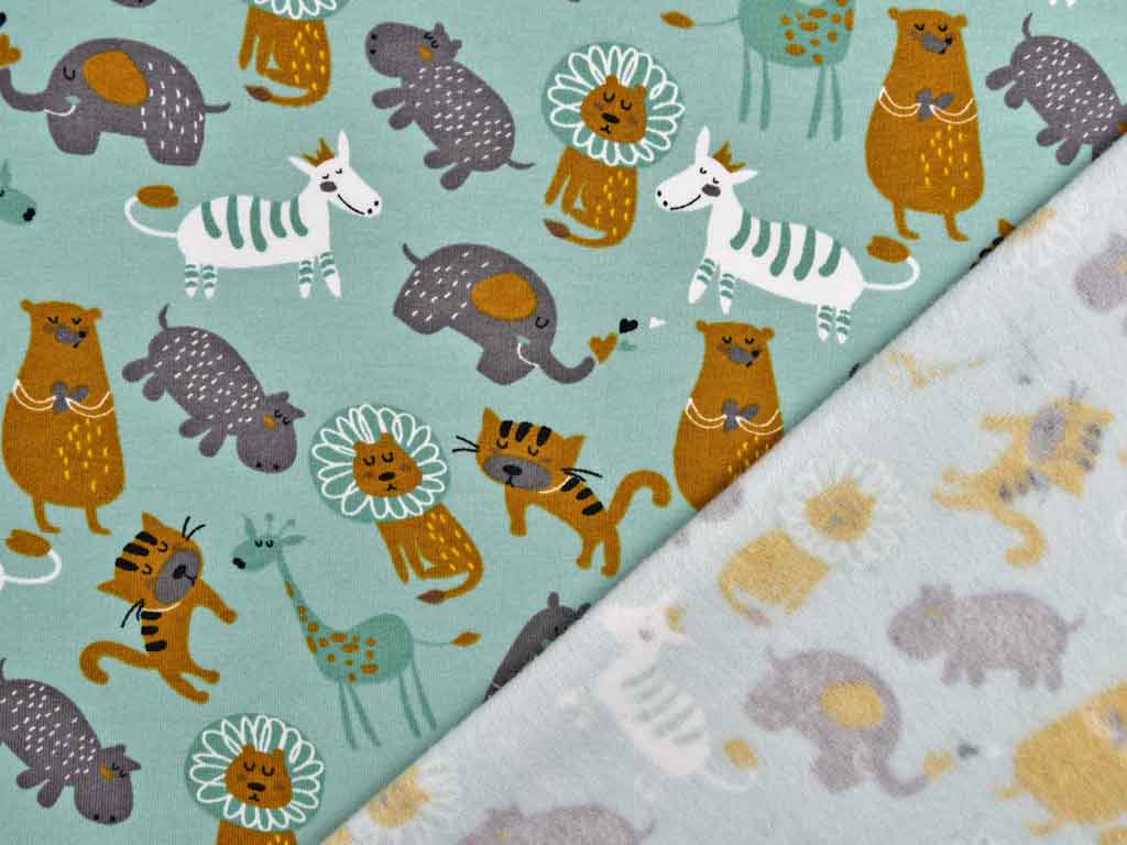 Ein besonders weicher mintfarbener Sweat mit unterschiedlichen Zootieren: Löwen, Giraffen, Zebras, Nilpferde, Tiger und Elefanten. Die Tiere sind in Ocker, Grau und Weiß und zwischen 4,0 cm und 6,0 cm groß. Die Rückseite ist angeraut und fühlt sich kuschelig weich auf der Haut an.