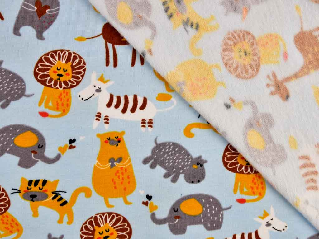 Ein besonders weicher hellblauer Sweat mit unterschiedlichen Zootieren: Löwen, Giraffen, Zebras, Nilpferde, Tiger und Elefanten. Die Tiere sind in Ocker, Grau und Weiß und zwischen 4,0 cm und 6,0 cm groß. Die Rückseite ist angeraut und fühlt sich kuschelig weich auf der Haut an.