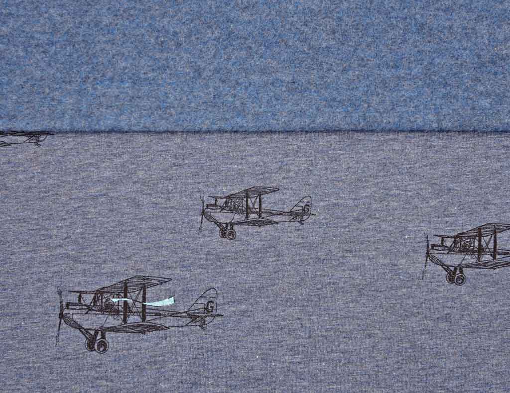 Aus der Mies & Moos Kollektion ein wunderschöner angerauter Sweat in dunkelblau meliert mit schwarzen Flugzeugen. Die Rückseite ist angeraut und somit kuschelig weich auf der Haut.