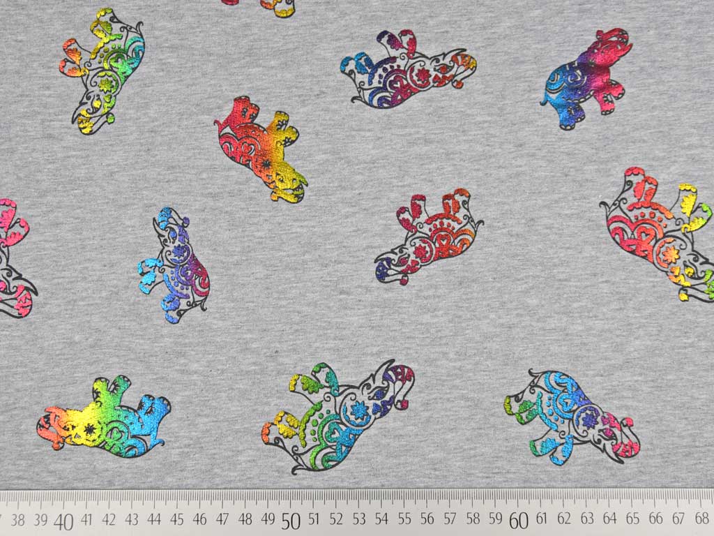 Ein weicher, leicht dehnbarer Sweat in hellgrau melange mit bunten Glitzerelefanten. Die Rückseite ist angeraut und kuschelig weich.