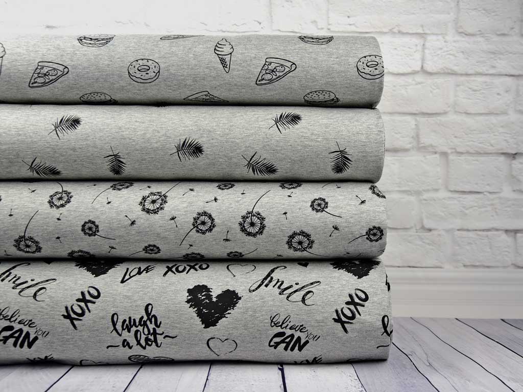 Ein weicher French Terry Sweat in trendigem Grau Melange mit Hamburgern, Eiswaffeln, Donuts, Pizzastücken, etc. Die Rückseite ist leicht angeraut und somit weich auf der Haut.