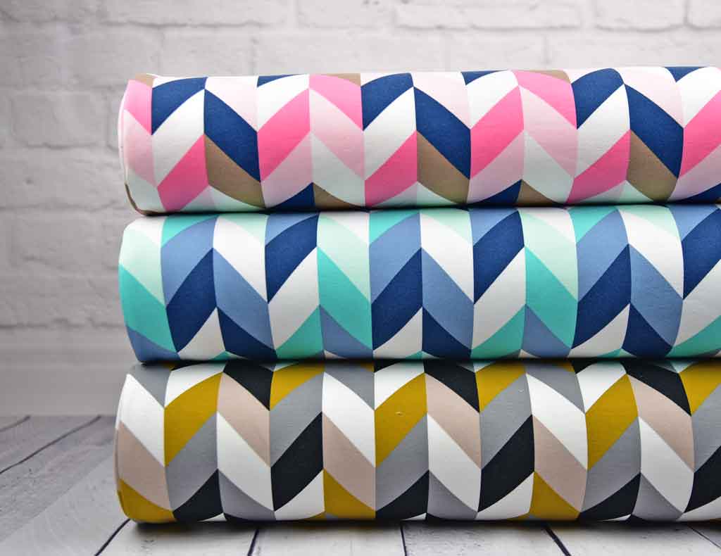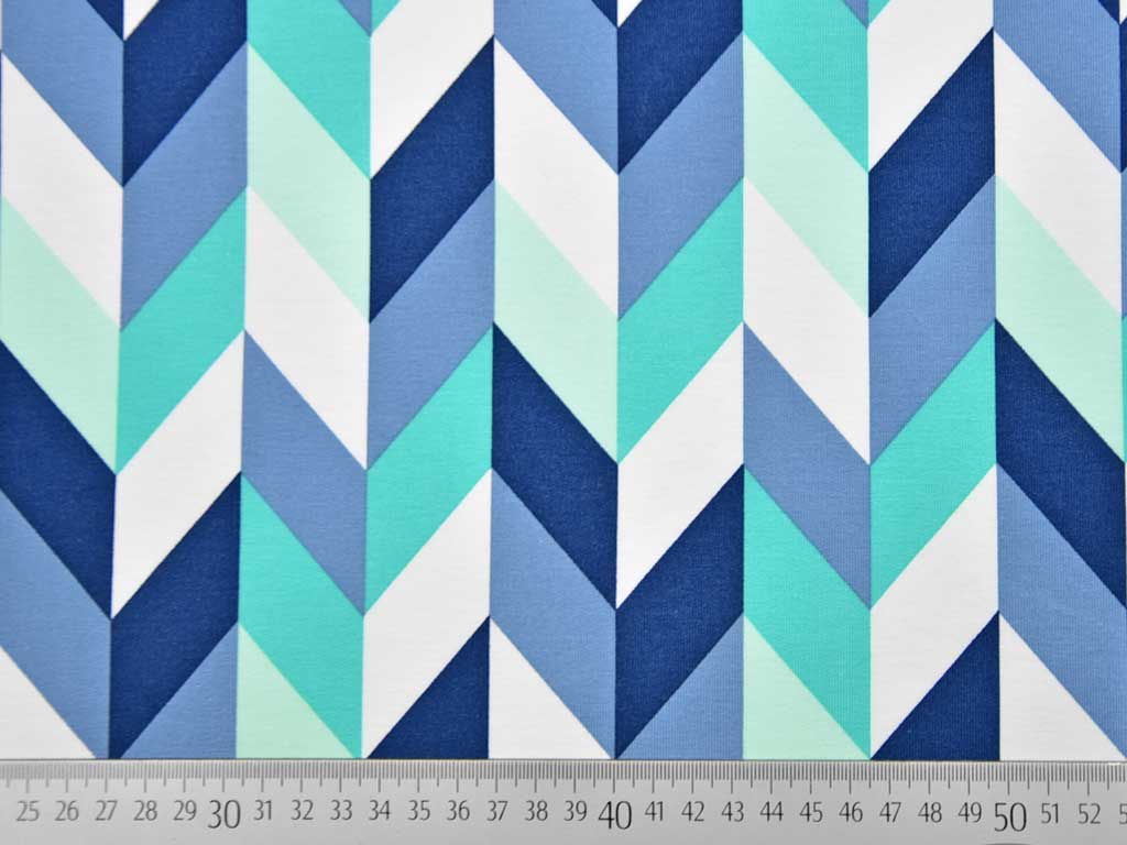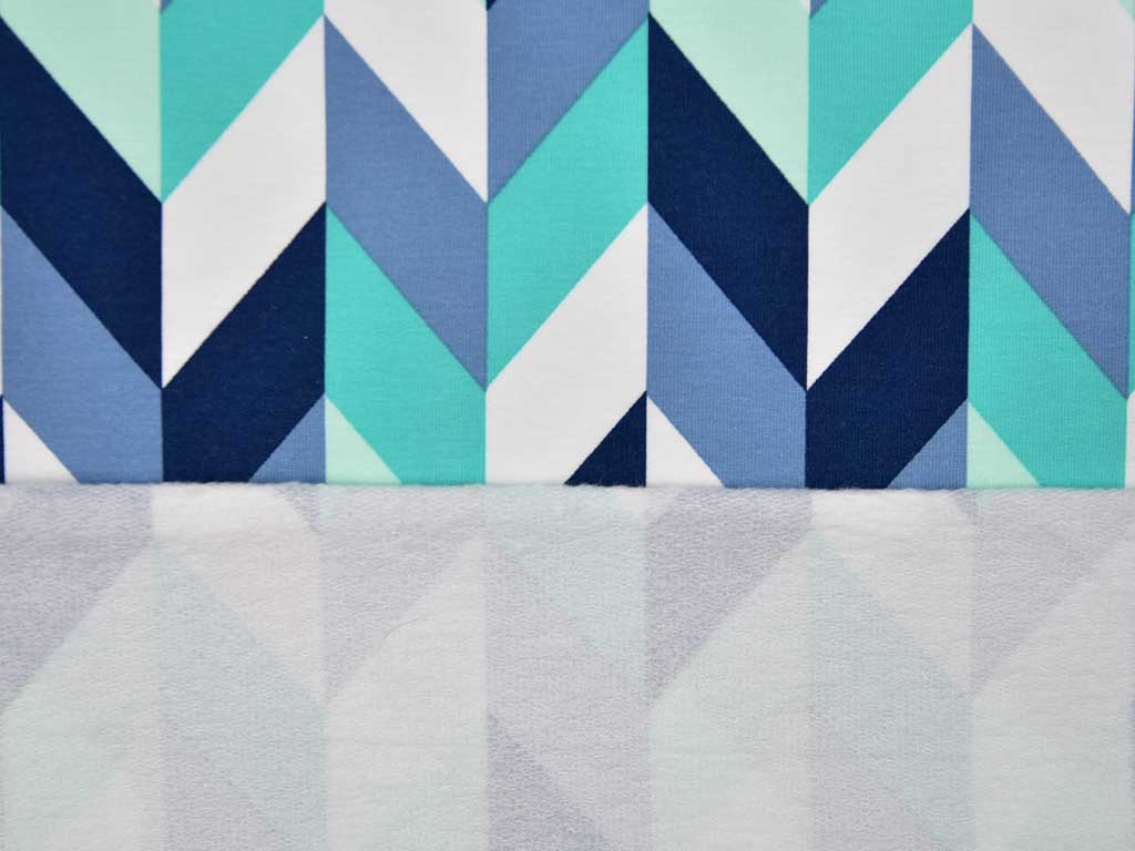 Ein weicher Sweat mit grafischem Pfeilmuster in hellmint, mint, jeansblau dunkelblau und weiß. Die Rückseite ist leicht angeraut und weich.