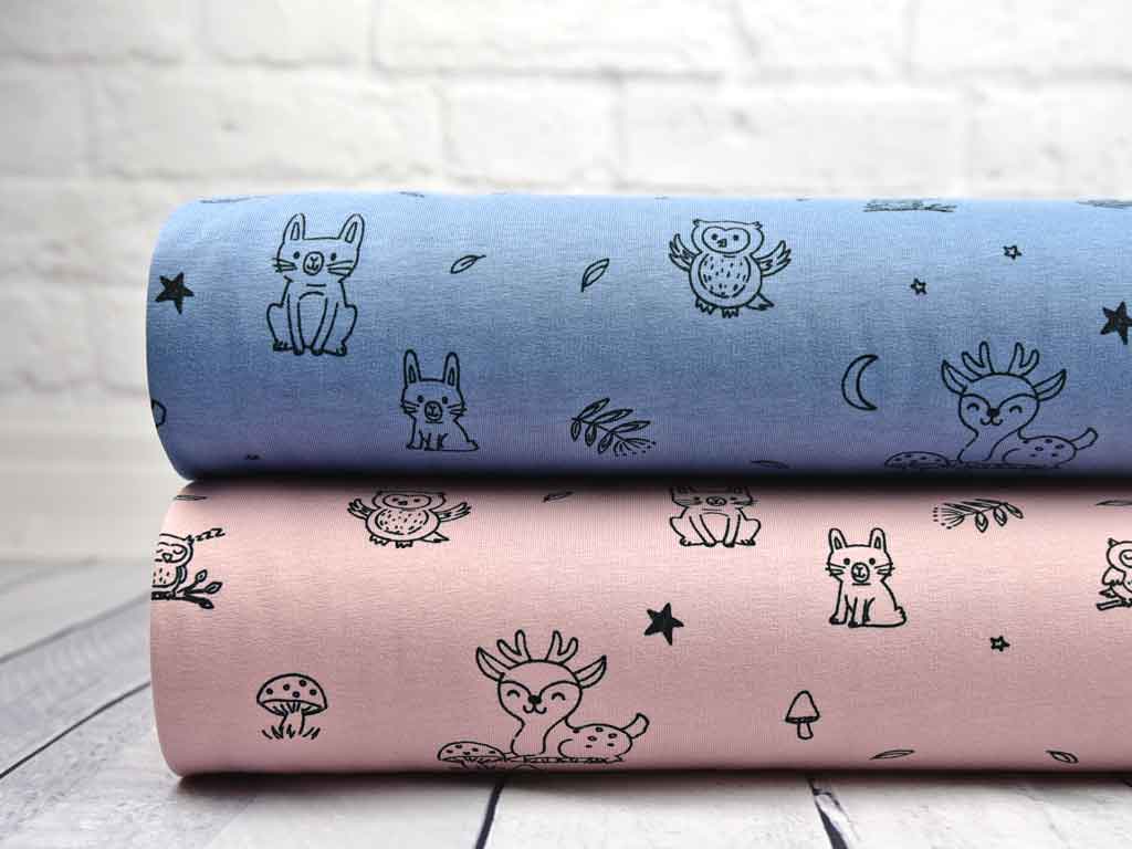Ein weicher Sweat in jeansblau mit Eulen, Füchsen, Rehen und Pilzen in schwarz. Die Rückseite ist angeraut und somit kuschelig weich.