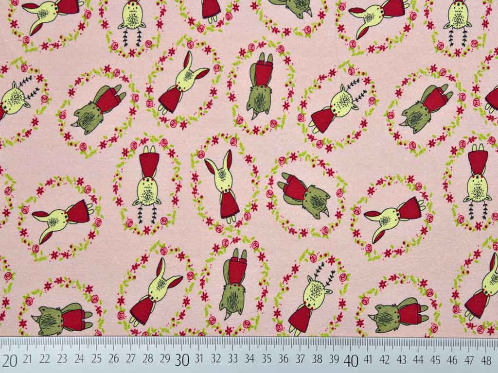 Ein weicher, leicht angerauter Sweat in rosa mit süßen Waldtieren in Blumenkränzen in rot, braun und grün.