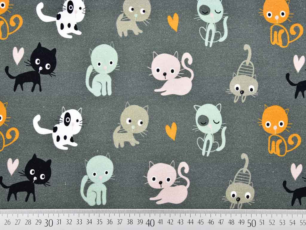 Ein toller, weicher, leicht angerauter Sweat in grau mit bunten Katzen in rosa, schwarz, grau, weiß und mint.