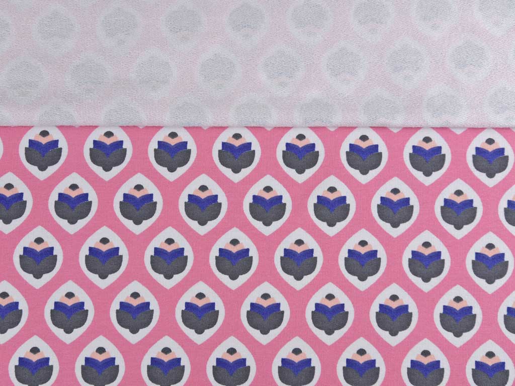 Ein wunderschöner French Terry (unangerauter Sweat) in pink mit Retrotulpen in grau,blau, rosa und weiß.