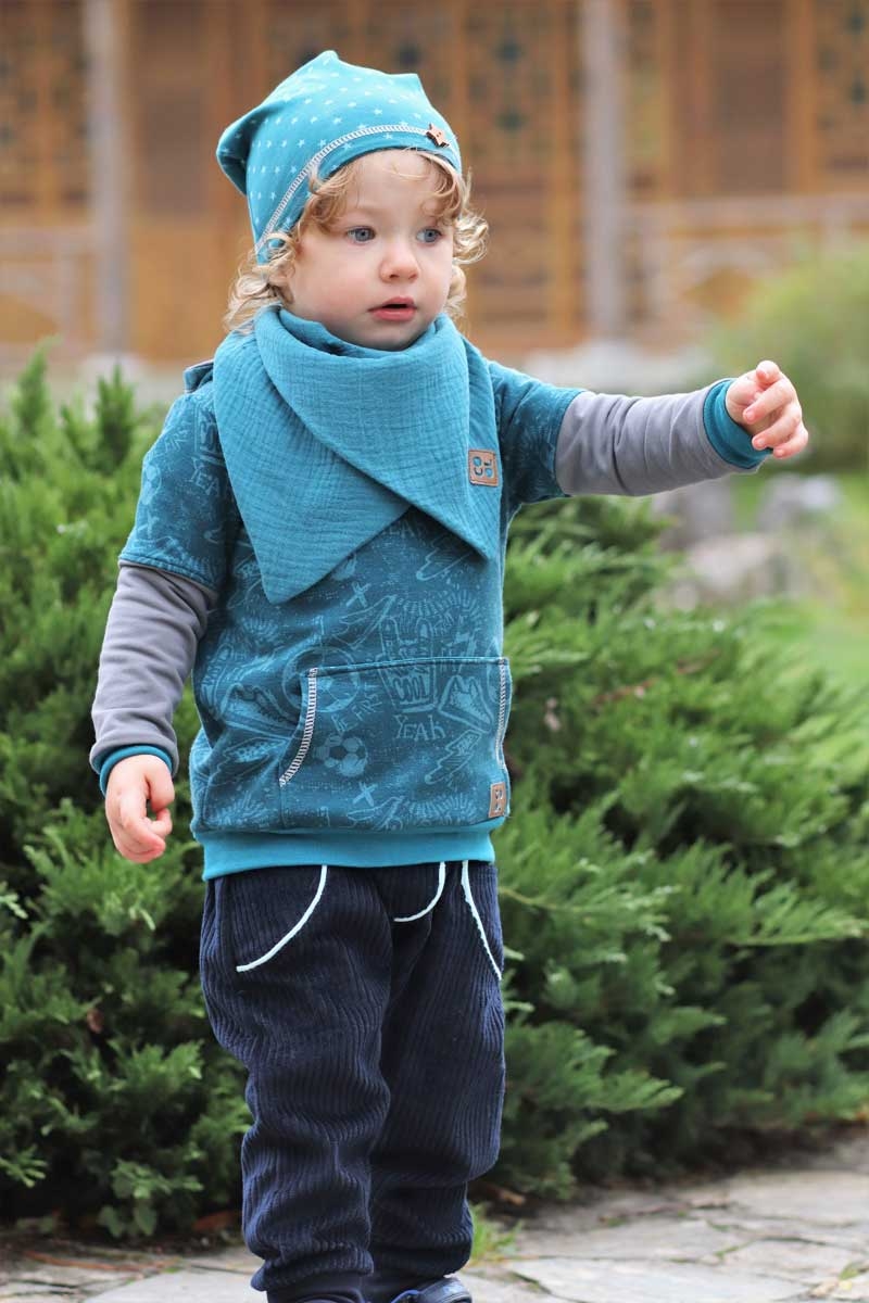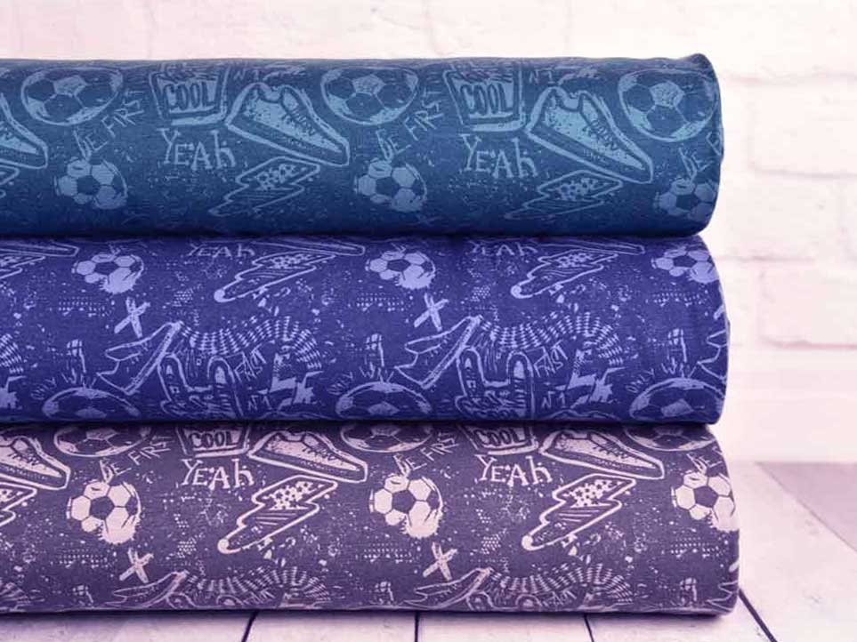 Ein weicher, petrolfarbener Sweatstoff mit mint Fußbällen, Turnschuhen und verschiedenen Schriftzügen und Motiven wie z.B. Cool, Year, Fast, etc. Die Rückseite ist angeraut und fühlt sich kuschelig weich auf der Haut an.