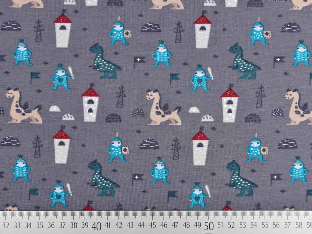 Ein weicher, dunkelgrauer Sweatstoff mit türkisen Rittern, hellgrau weinroten Türmen, beigen Drachen und petrolfarbenen Dinos. Die Rückseite ist angeraut und kuschelig weich.