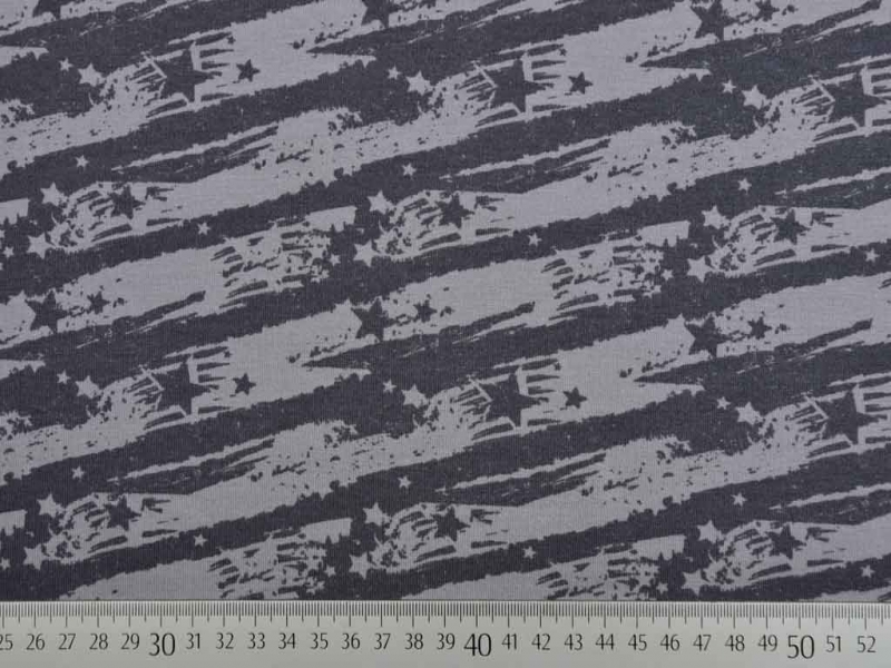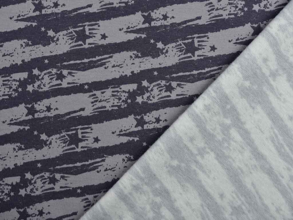 Ein weicher, hellgrauer Sweatstoff mit dunkelgrauen unregelmäßigen graffitiartigen Streifen und Sternen, die an die amerikanische Flagge erinnern. Das gesamte Motiv erinnert an einen amerikanischen Vintage Stil. Die Rückseite ist angeraut und fühlt sich kuschelig weich auf der Haut an.