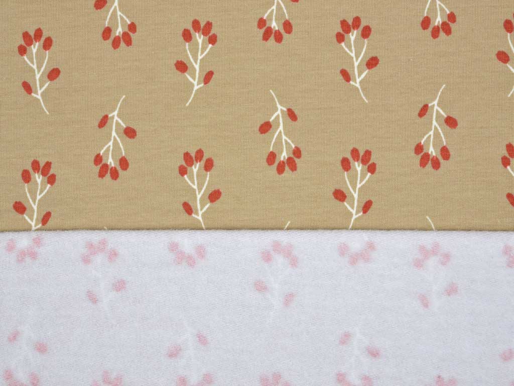 Ein weicher Sweat in beige mit Zweigen und rostbraunen Knospen. Die Rückseite ist angeraut und somit kuschelig weich.